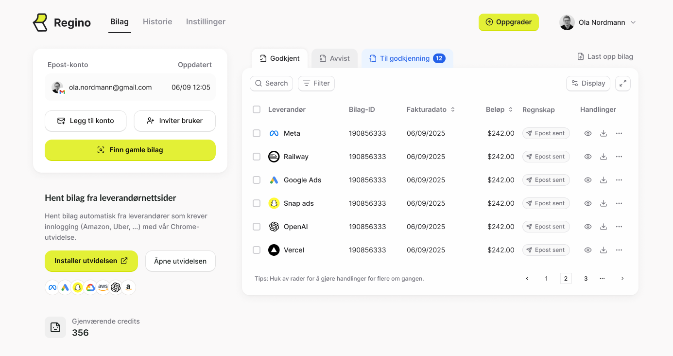 Regino dekker hele bilagsflyten – fra innhenting og tolkning til automatisk innsending til bilagsmottak.